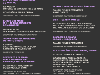 L’Ajuntament de Manacor ha presentat aquest dimecres el programa del Març feminista i, en especial, l’Embranzida, les diades feministes que tendran lloc els propers 15 i 16 de març. Un mes ple d’activitats organitzades amb l’objectiu de visibilitzar i reivindicar els drets de les dones, promoure la igualtat i generar espais de reflexió i transformació social.