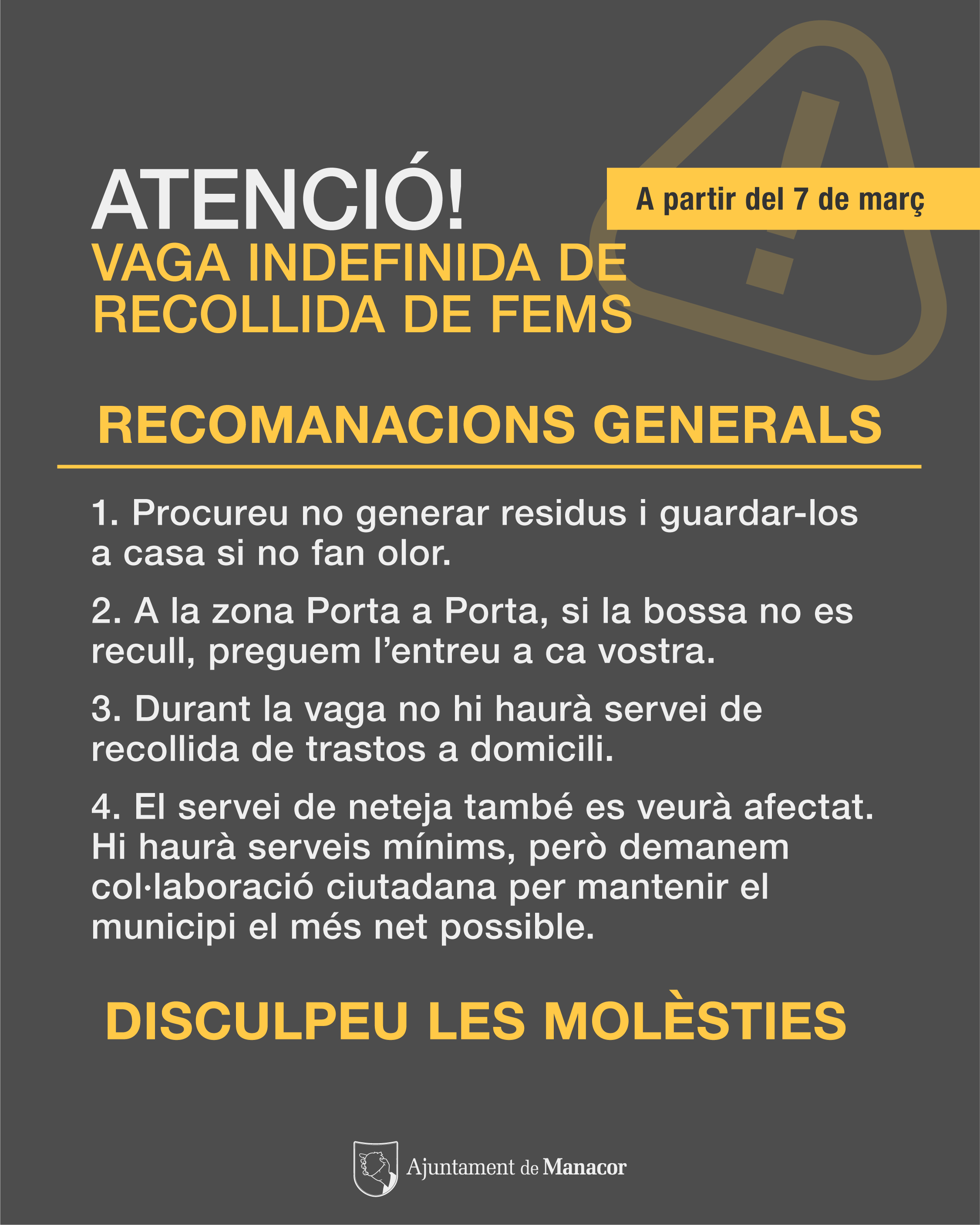 L’Ajuntament de Manacor demana la col·laboració ciutadana davant aquesta convocatòria indefinida de vaga al servei de recollida de residus, que també afecta el servei de neteja del municipi. Per això, es prega que els veïns generin els mínims residus possibles i que els guardin a casa si no fan olor. Durant la vaga no hi haurà servei de recollida de trastos a domicili.
