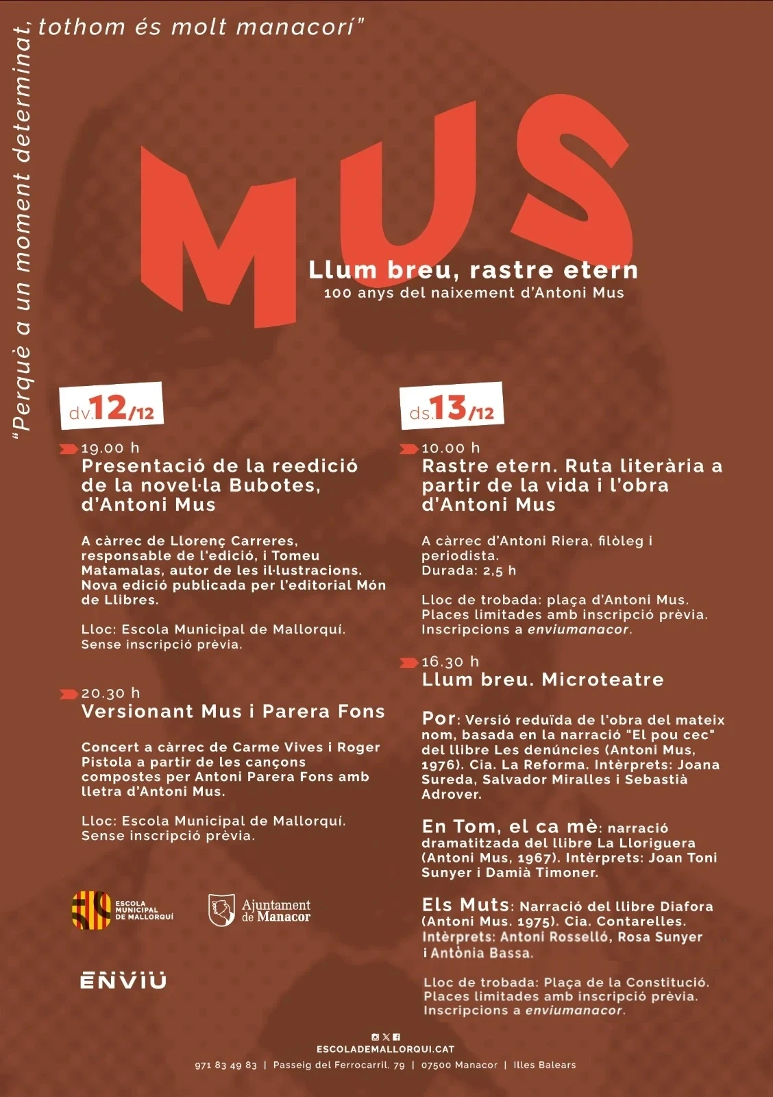 La programació continuarà dissabte 13 de desembre amb una immersió en el llegat literari i vital de l’autor. A les 10.00 h, des de la plaça d’Antoni Mus, s’iniciarà l’itinerari “Rastre etern”, una ruta literària que permetrà descobrir el Manacor d’Antoni Mus, els espais que marcaren la seva vida i la interpretació de la seva obra. El recorregut, conduït pel filòleg i periodista Antoni Riera, tendrà una durada aproximada de dues hores i mitja i requereix inscripció prèvia a https://enviumanacor.cat