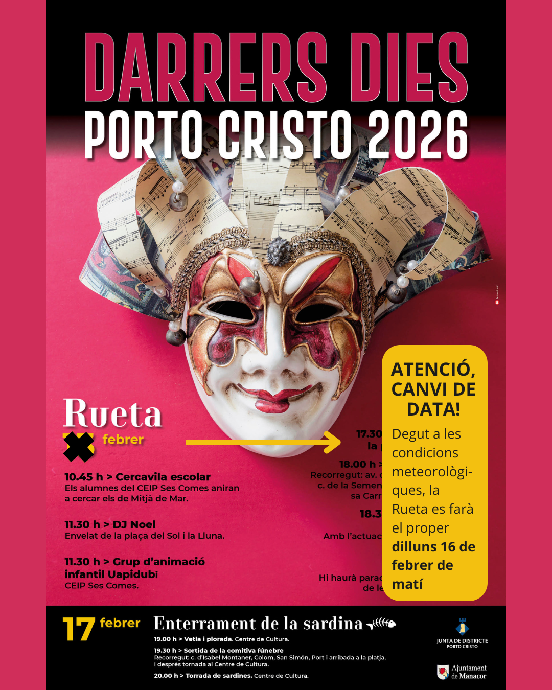 A s'Illot, la Rueta prevista per a aquest de matí s'ajorna a dimarts dia 17 de febrer de matí, mentre que a Porto Cristo, la Rueta prevista per a divendres de matí s'ajorna a dilluns amb el mateix horari i programació.