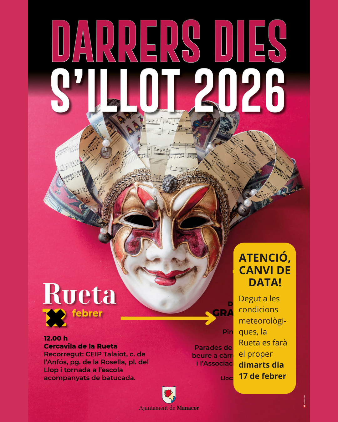 L’Ajuntament de Manacor informa que la Rueta prevista inicialment per a aquest dijous, queda ajornada a dilluns dia 16 de febrer, davant la previsió de condicions meteorològiques adverses, amb fort vent i activació de l’alerta taronja.