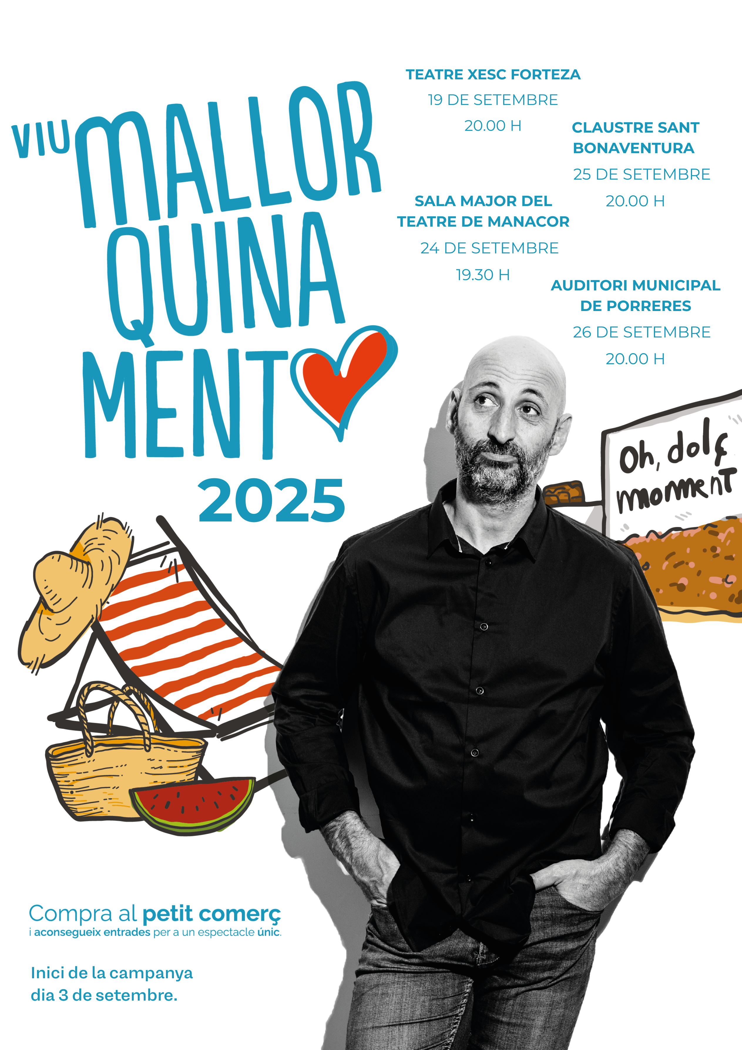 L’espectacle arribarà a Manacor el dimarts 24 de setembre, a la Sala Major del Teatre de Manacor, i hi ha 453 entrades a disposició dels veïnats i veïnades que comprin als comerços de Manacor i Porto Cristo adherits a la campanya. Els tiquets que obtinguin als establiments s’hauran de bescanviar per les entrades oficials a partir d’aquest dimecres, 3 de setembre, a la Delegació de Comerç de l’Ajuntament de Manacor (carrer Major, 22).