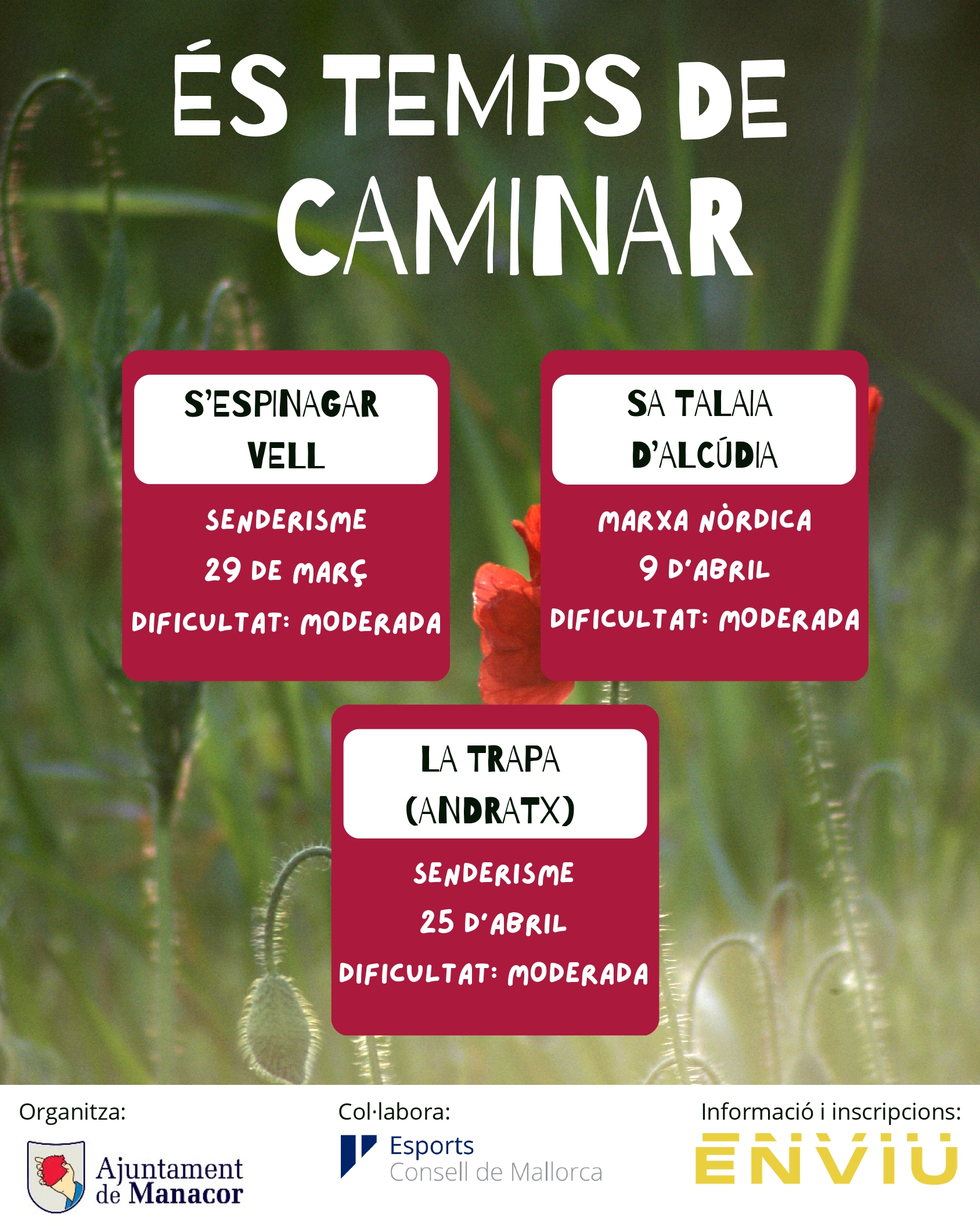 El programa arrenca aquest diumenge 29 de març amb una ruta de senderisme per s’Espinagar Vell, amb sortida a les 8 h del matí des de la Torre de l’Aigua de Cales de Mallorca. La segona cita serà el 9 d’abril, amb una proposta de marxa nòrdica fins a la Talaia d’Alcúdia, mentre que la tercera i darrera sortida d’aquest primer bloc tindrà lloc el 25 d’abril, amb una excursió de senderisme fins a la Trapa, al municipi d’Andratx.