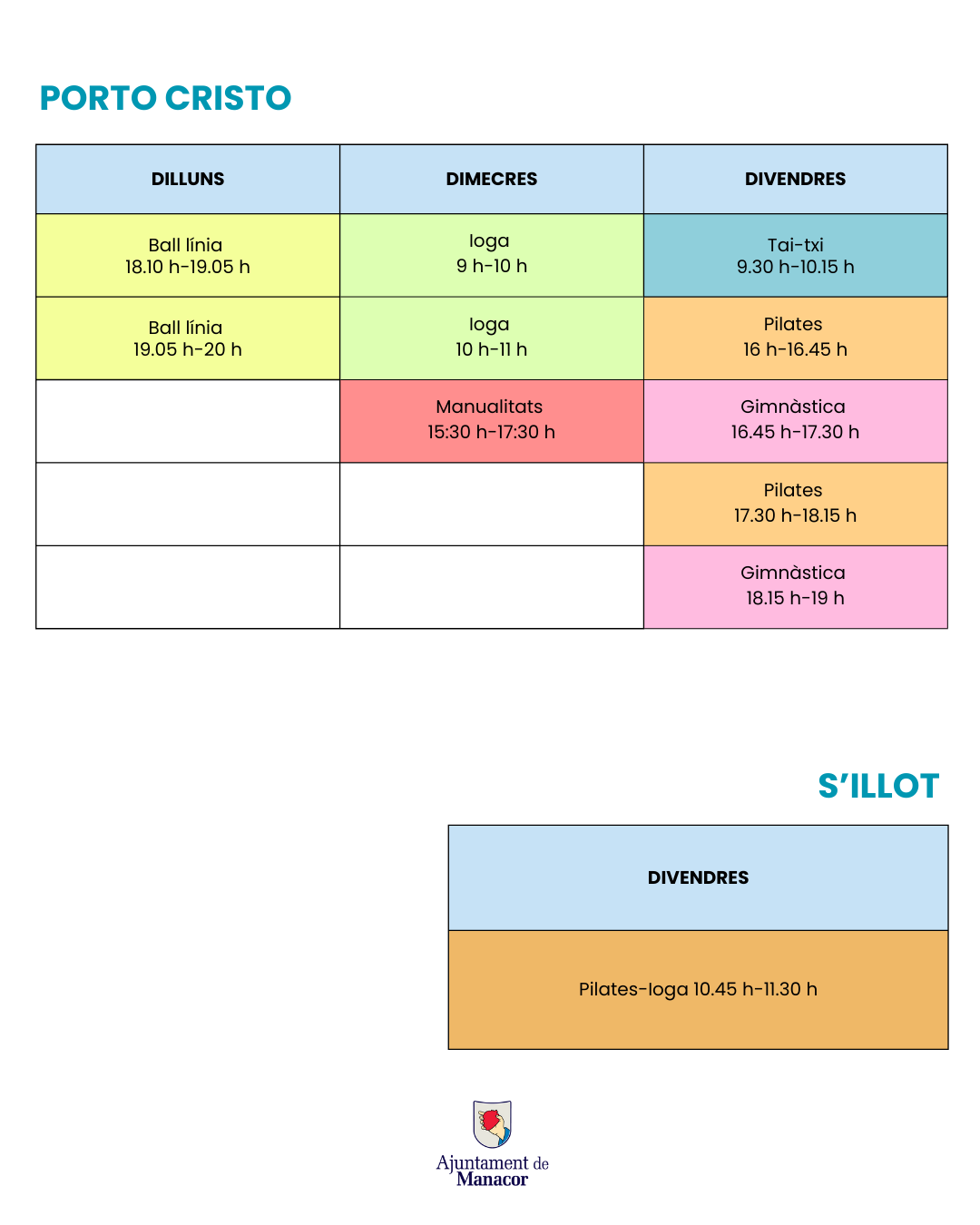 El programa inclou una àmplia varietat de propostes pensades per promoure l’envelliment actiu i el benestar físic i emocional dels participants. A més, dins el marc de les activitats impulsades per la delegació de la Gent Gran, s’han incorporat una sèrie de novetats tant a Manacor com a Porto Cristo i s’Illot. Entre aquestes hi ha: Ioga, Ball en línia, Tai-txi, Tonificació, Gimnàstica, entre d’altres.