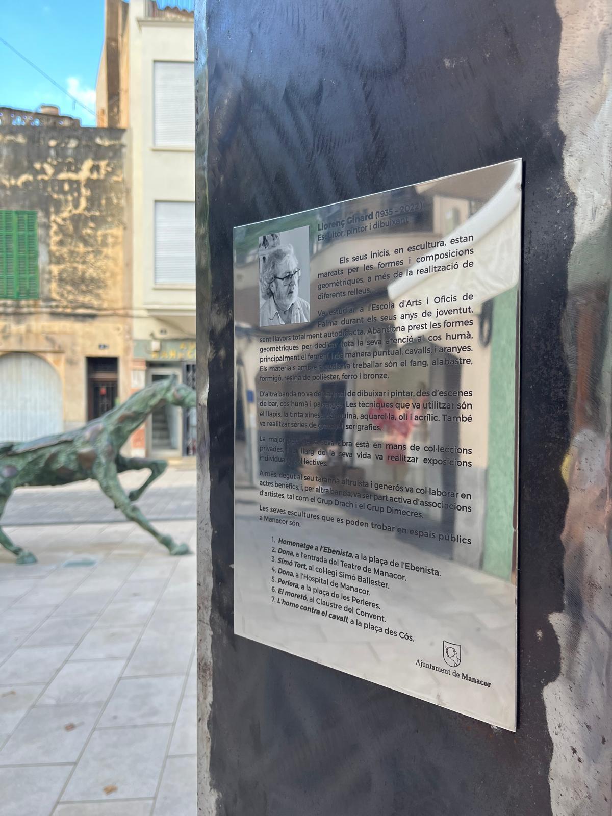 El tòtem instal·lat recull aquesta història, a més d’una síntesi de la trajectòria artística de Llorenç Ginard, escultor, pintor i dibuixant que, al llarg de la seva vida, va deixar una obra marcada per la força del cos humà i per una gran varietat de materials i tècniques. A Manacor, Ginard és autor de diverses escultures públiques, com Homenatge a l’Ebenista, Perlera o Dona, entre d’altres.