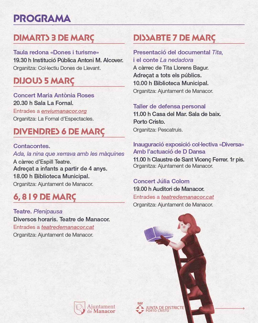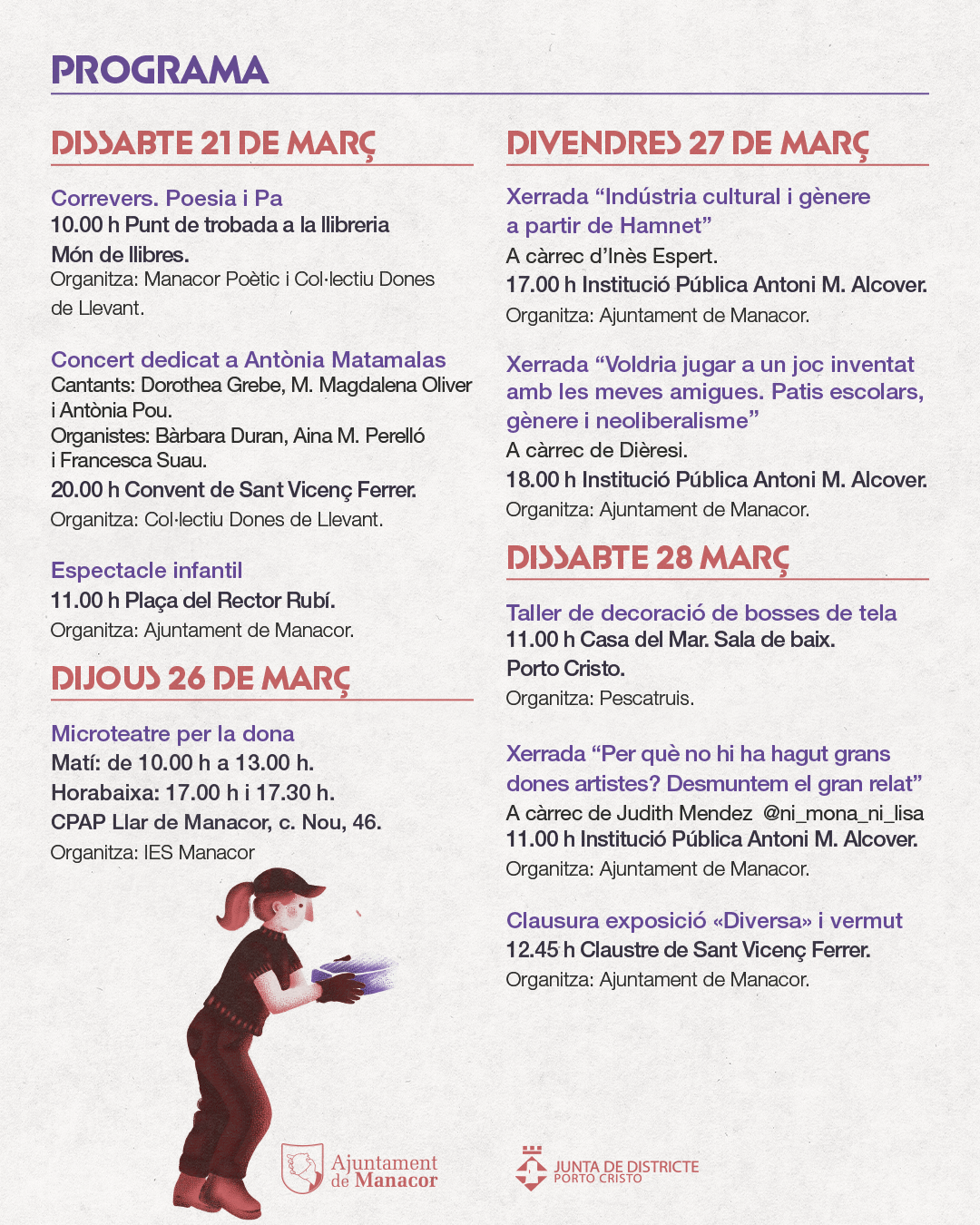 També s’ha programat una xerrada de la historiadora de l’Art Judith Méndez sobre la presència de les dones al cànon artístic i una revisió de la història de l’Art amb perspectiva de gènere. Així mateix, el programa inclou les obres teatrals 'Plenipausa' (Teatre de Manacor), 'Úter Medea' (Sala La Fornal), 'De la sal de la ferida n'he fet un tatuatge' (Casa de Cultura de Porto Cristo) i 'Microteatre per a la dona', de l'IES Manacor.