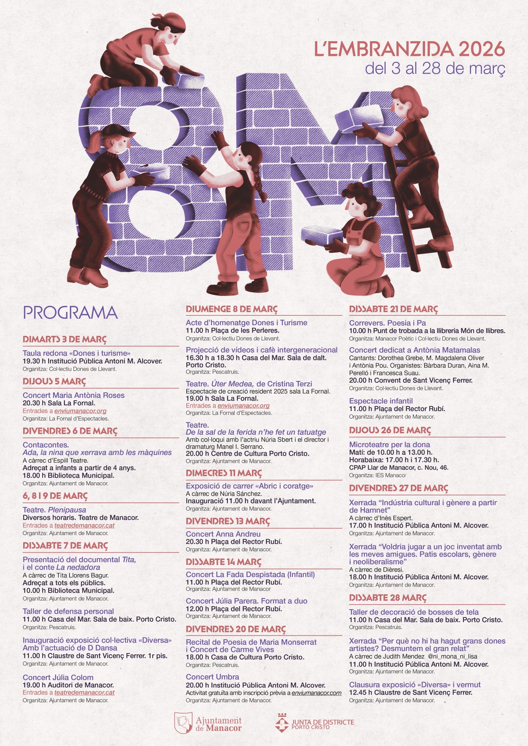 “Volem música que ens emocioni, però també espais que ens facin pensar. Una comunitat forta és aquella que celebra, però també la que dialoga i es qüestiona”, ha conclòs la delegada d’Igualtat, Joana Maria Llull, tot convidant la ciutadania a participar activament dels actes i a “sortir al carrer per reivindicar un Manacor feminista”.