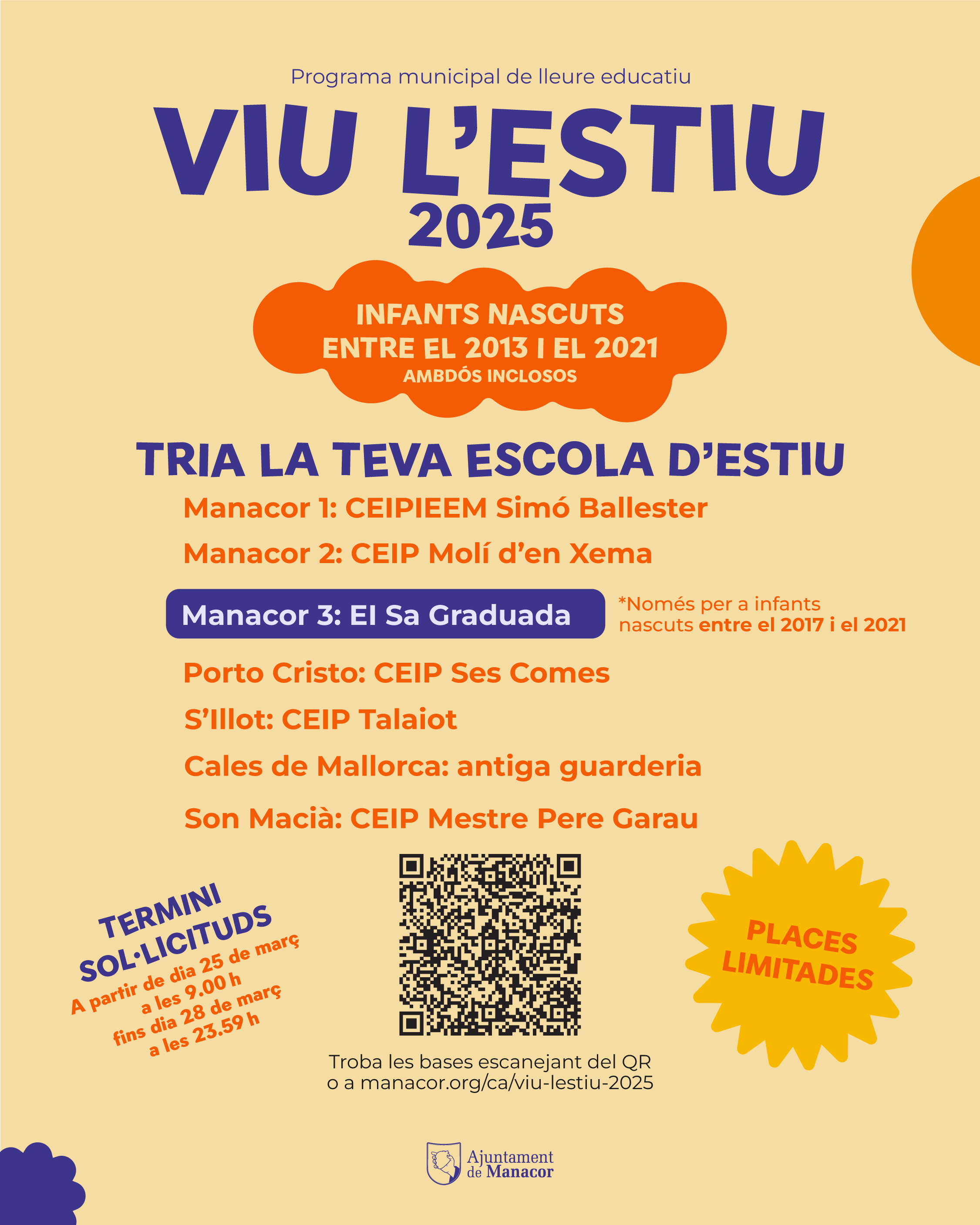 L'Ajuntament de Manacor posa en marxa una nova edició de VIU L’ESTIU 2025, el programa d’Escoles d’Estiu de Temps Lliure Educatiu que tendrà lloc durant els mesos de juliol i agost als diferents nuclis del municipi. Aquest projecte té com a objectiu oferir un espai de diversió i aprenentatge per als infants i joves, fomentant valors com la convivència, la inclusió i el respecte per l’entorn.