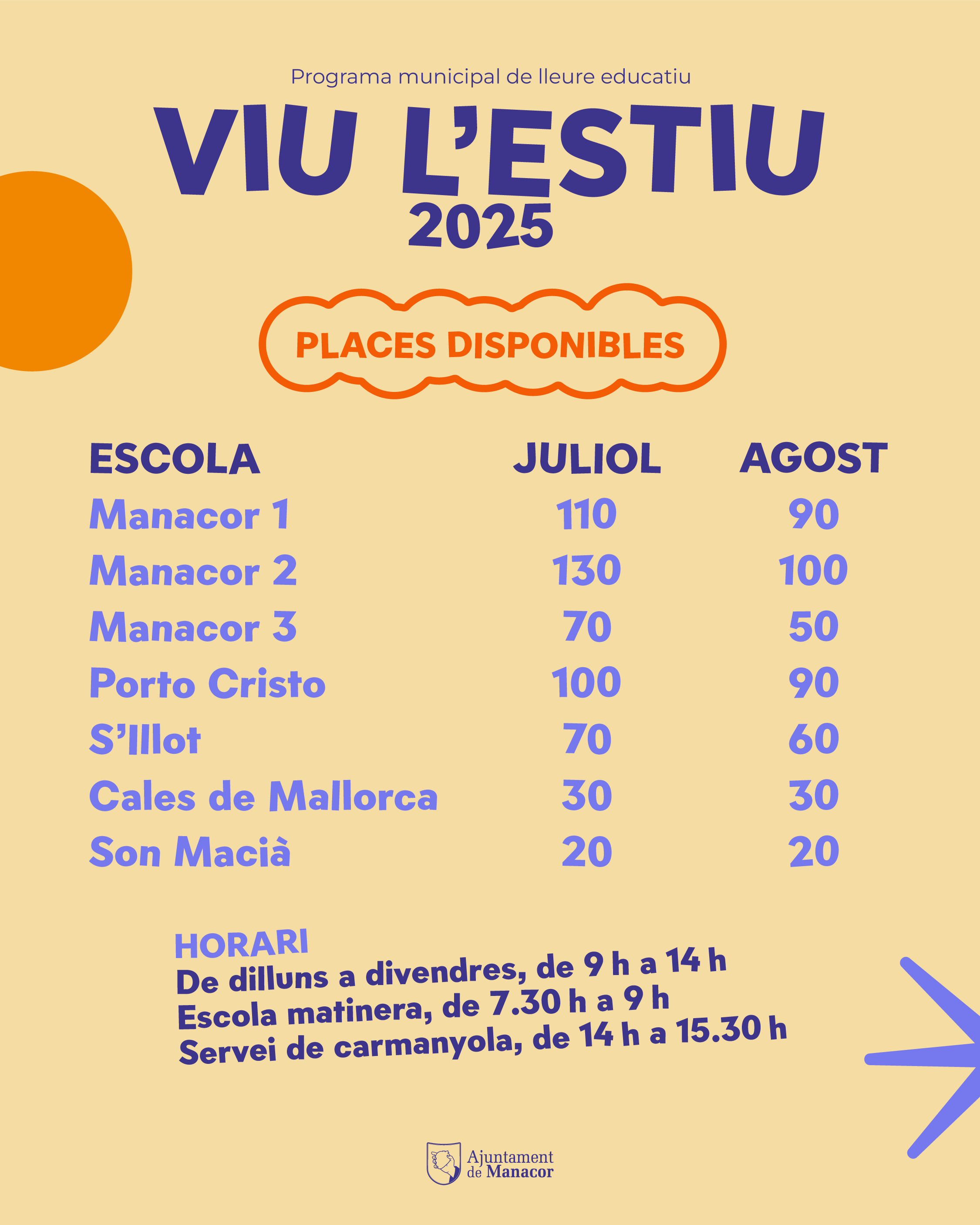 Amb un total de 970 places disponibles, les escoles d’estiu es duran a terme a Manacor, Porto Cristo, s’Illot, Cales de Mallorca i Son Macià, amb la següent distribució: